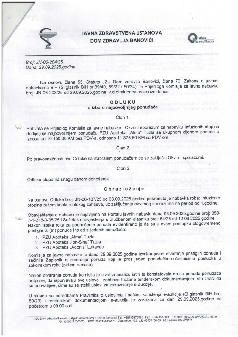 2025-11-20 09:09:21 - ODLUKA O IZBORU NAJPOVOLJNIJEG PONUĐAČA - Infuzione otopine